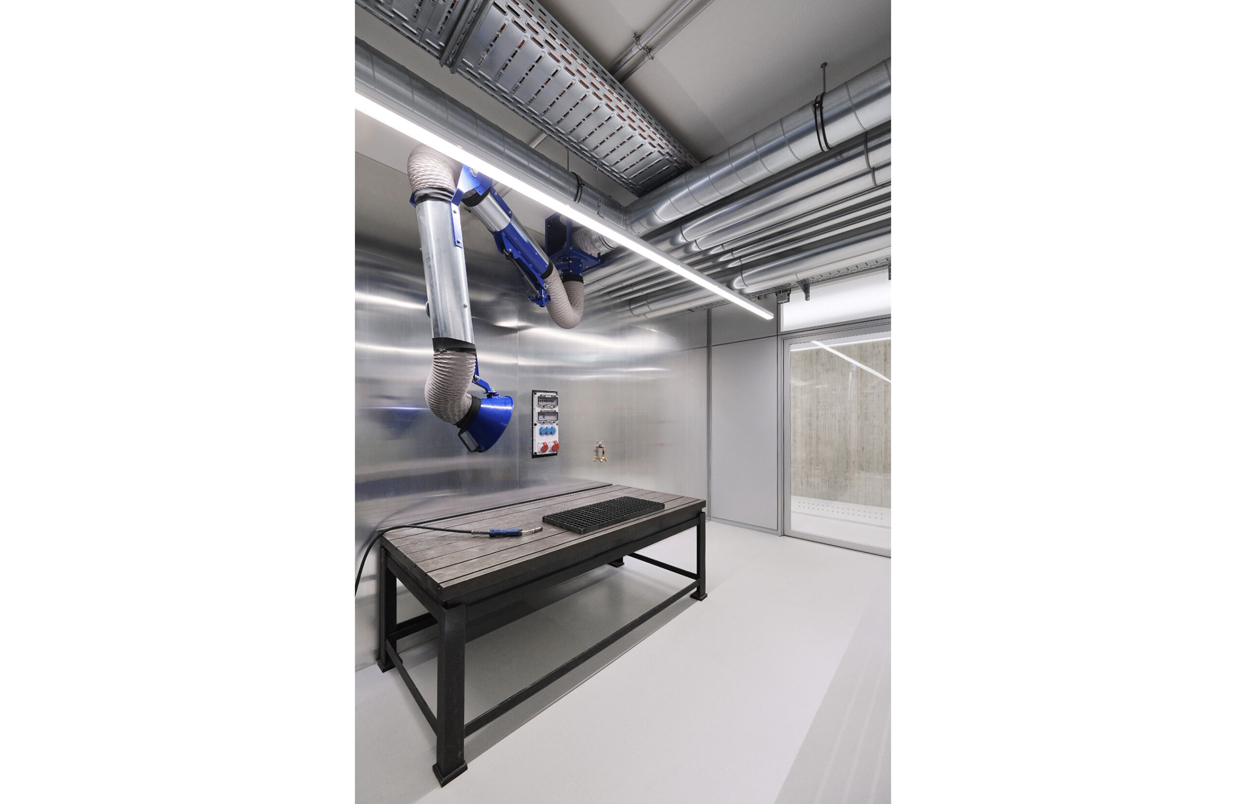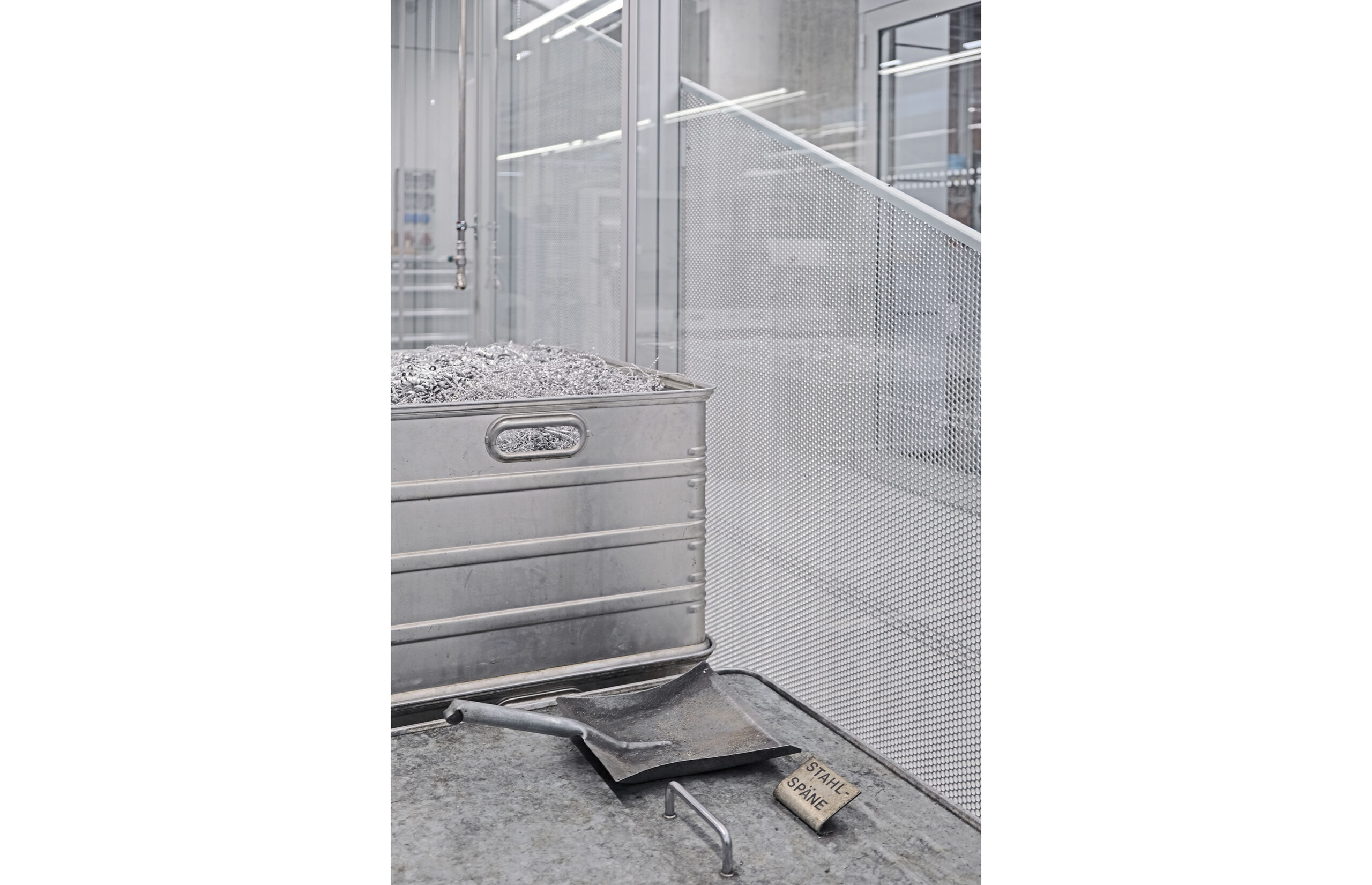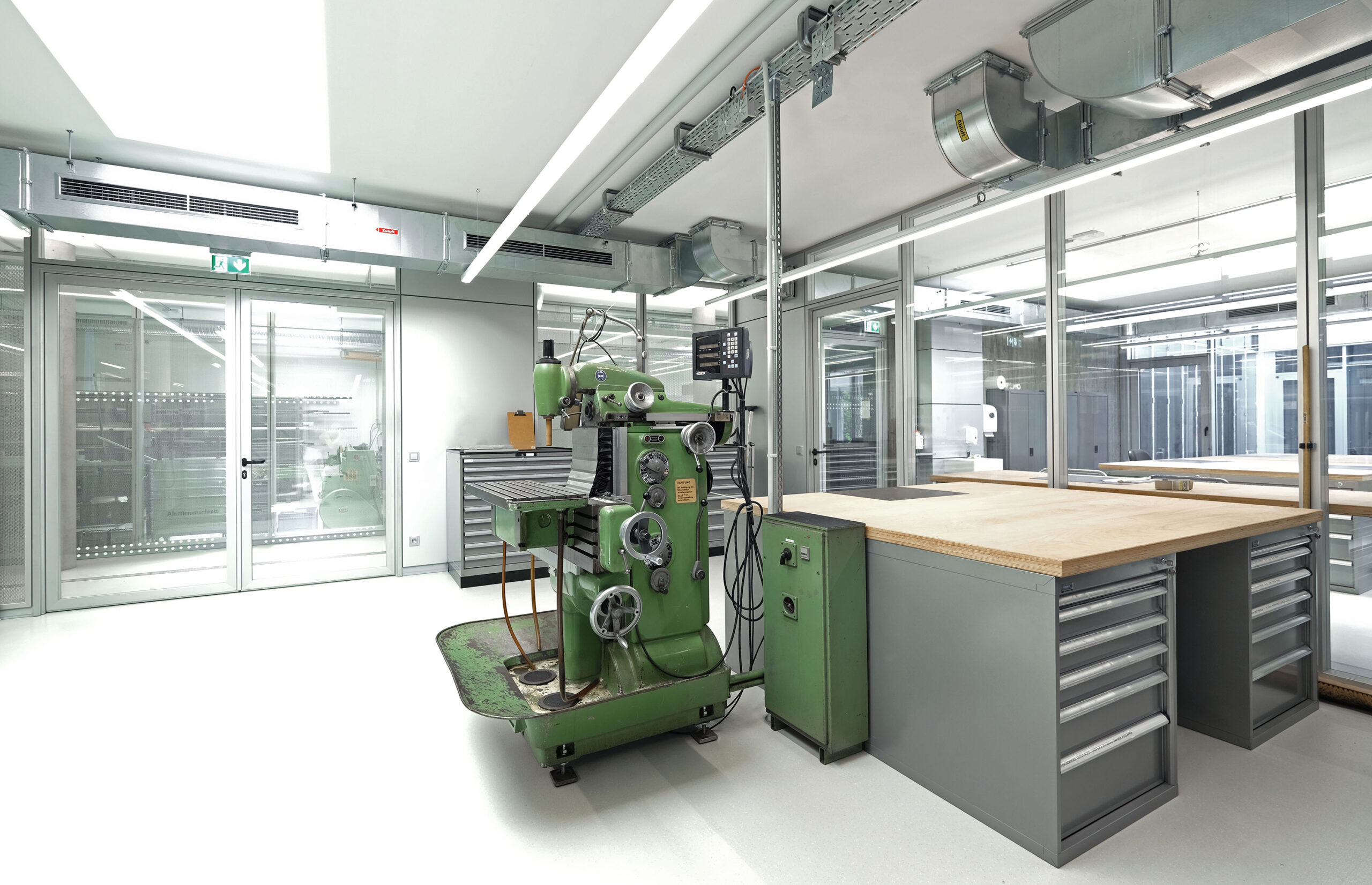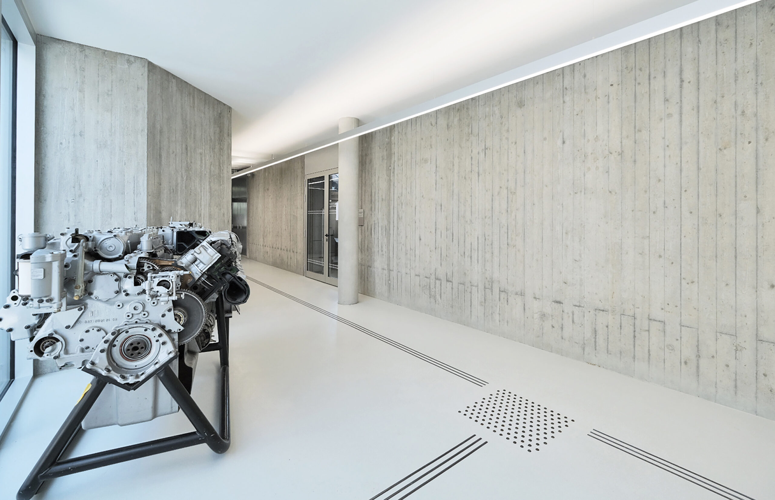 Die konsequent reduzierte Materialität bietet eine zurückhaltende Bühne für die aufwendig restaurierten Metallbearbeitungsmaschinen und hochsensiblen Messinstrumente.