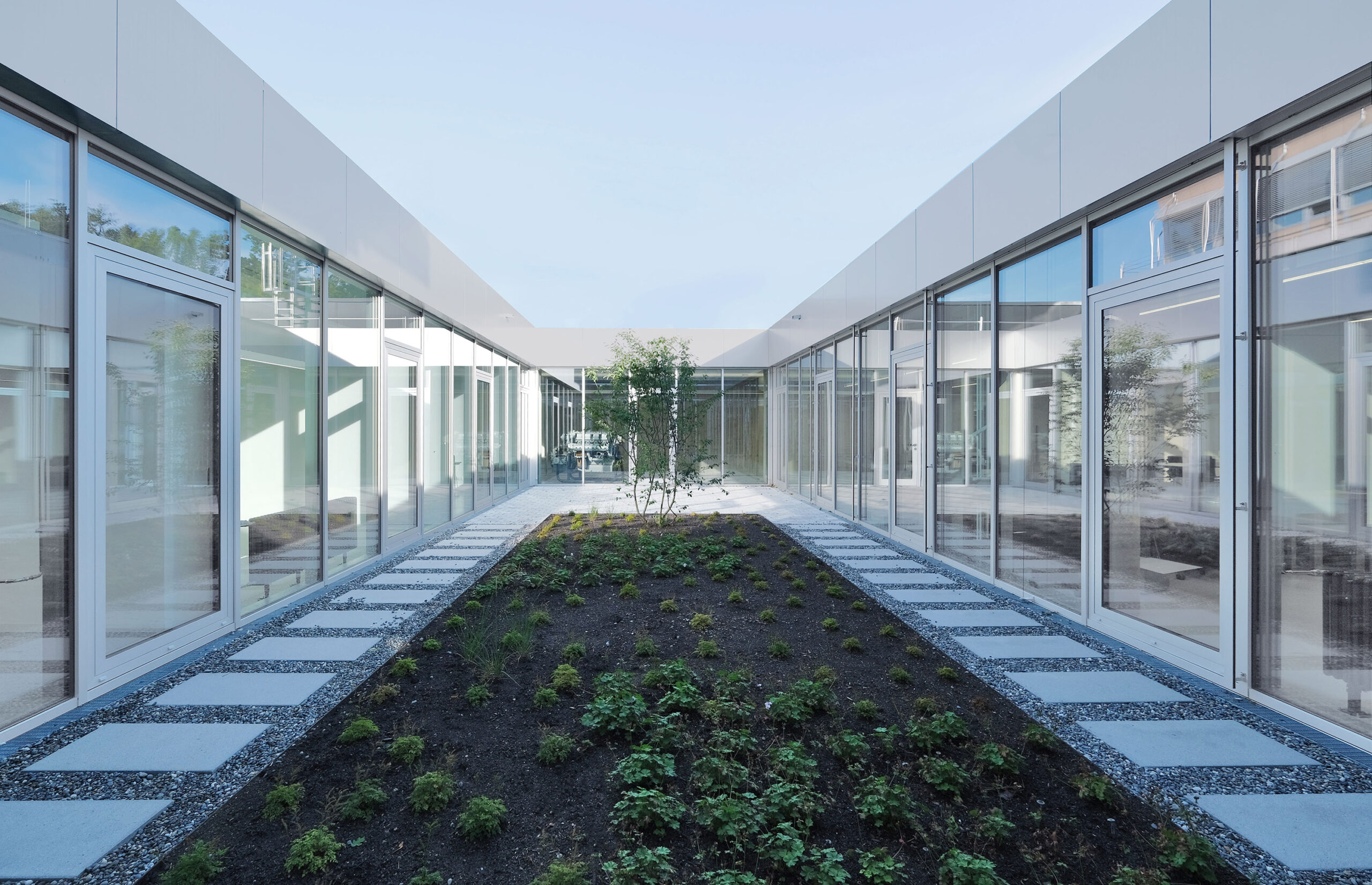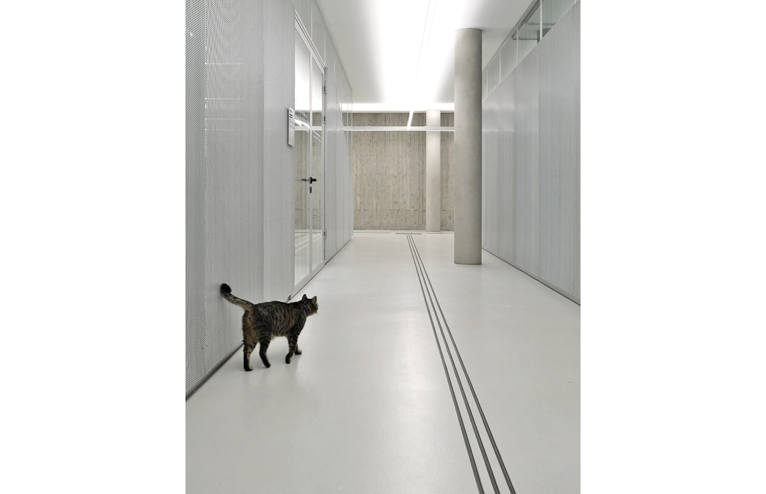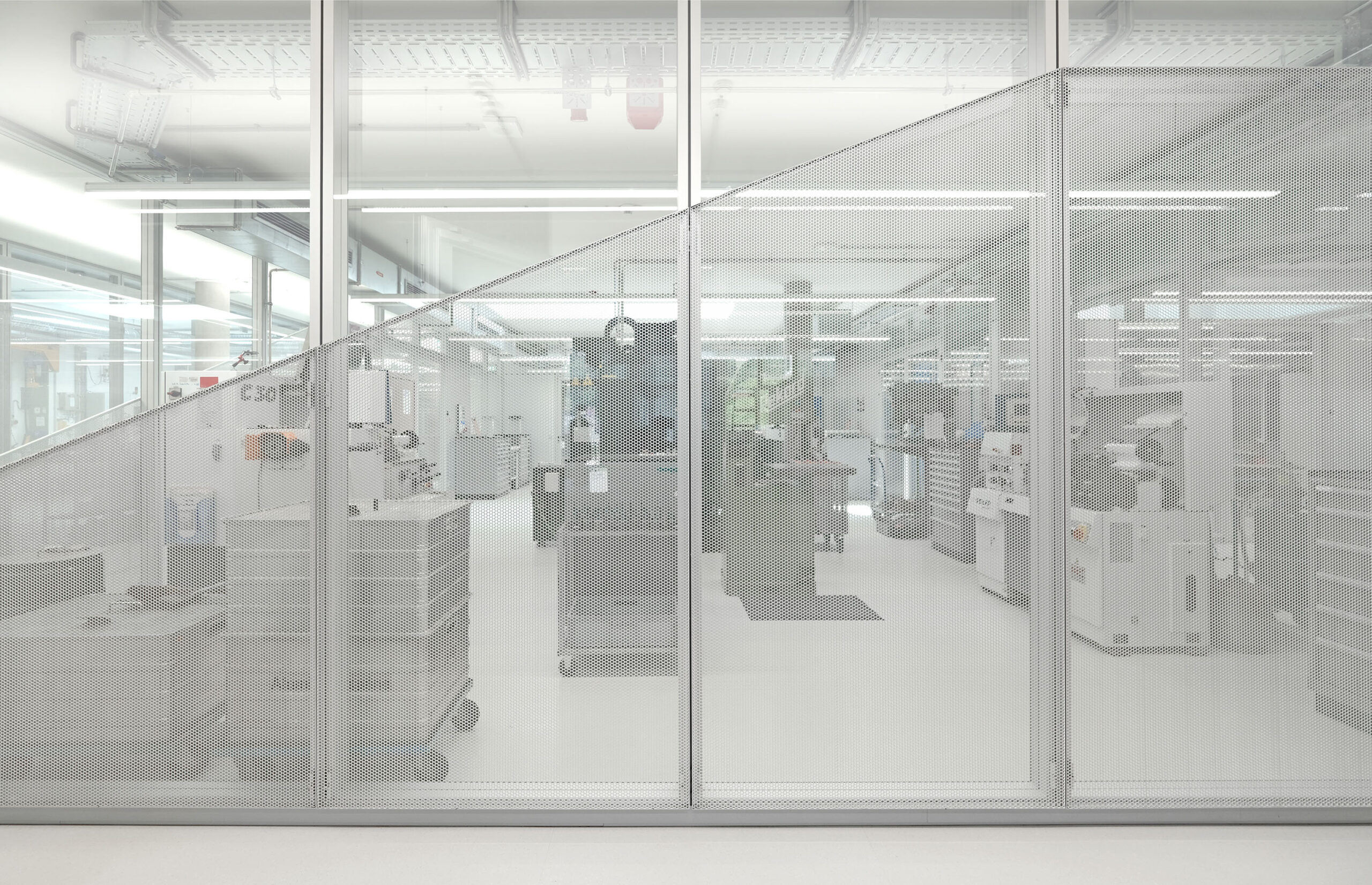 Großflächige Verglasungen gewähren bereits vom Flur aus einen Einblick in die hochinstallierten TechLabs und fördern damit einen visuellen Wissenstransfer zwischen den unterschiedlichen Kompetenzbereichen.
